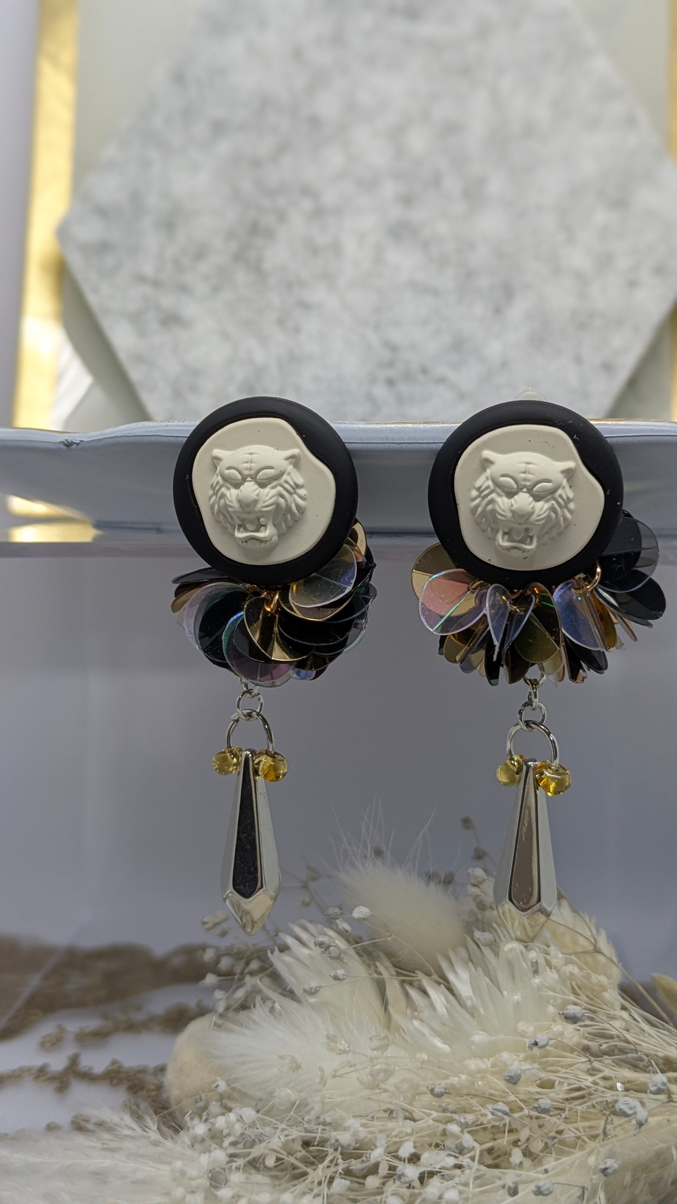 タイガーモチーフのデザインが耳元で目を引き、男性にもご使用していただけるようなデザインになっております。動くたびに繊細に揺らめく様子は、様々なコーディネートに個性を加え、ファッションに華を添えます。